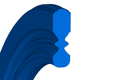 Double-acting piston seal for pneumatics, with two lateral notches that allow it to adapt to the fluid pressure. The rounded profile of the sealing area and the flexibility of the body allow to maintain a lubricating film and therefore the seal has a low friction.