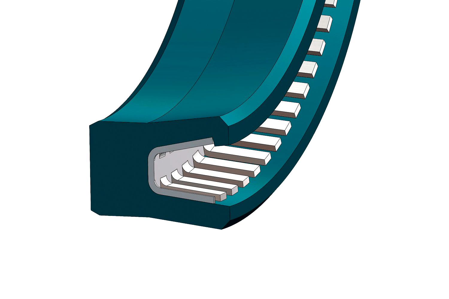 Single-acting stem seal consisting of two elements: a PTFE collar (with loads) and a metal spring that tensions the collar and maintains its circular geometry around its entire perimeter, both inside and outside. The sealing lip has a protrusion on the inside that keeps the spring in place.