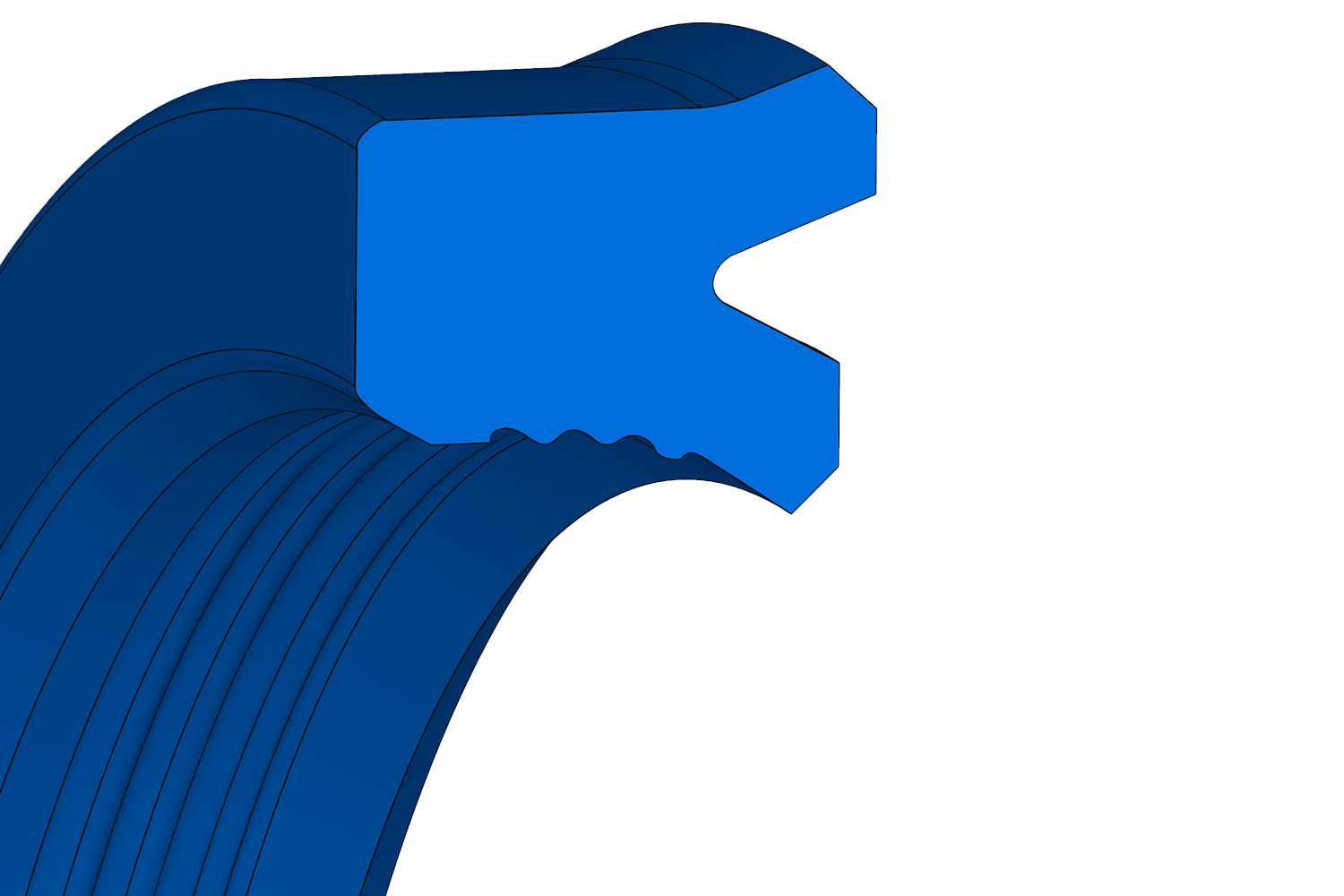 Collar with asymmetrical elastomer profile whose inner diameter contact surface is grooved. The inner lip is shorter than the outer lip and is designed to ensure the stability of the part in its housing. It can be used as a single stem seal or as a 2nd stem seal in a sealing system.