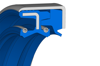 Simmerring® seal in a «back-to-back» lip and dust lip configuration, reinforced with a polyurethane seal that allows slight axial movements.