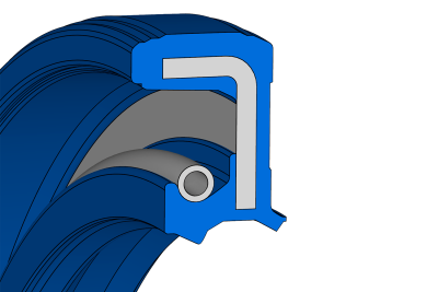 Right-angle, elastomer-coated rim seal, patented short lip, helical spring and dust lip.