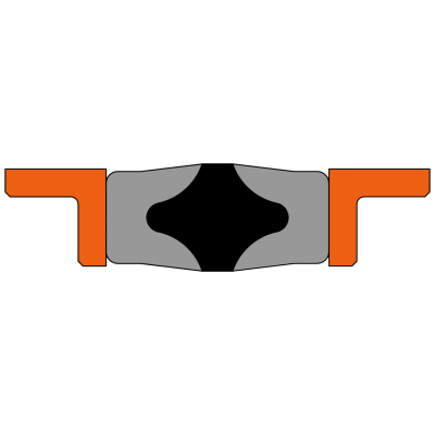 – El conjunto consta de una junta y dos cojinetes en forma de L. El centro del sello es de caucho que está adherido a dos bases de sección en «U» de tela cauchutada y que la carcasa comprime para obtener un sello efectivo de baja presión. Cuando la presión aumenta, el caucho energiza la sección en ‘U’ y la deforma en la carcasa, aumentando el área de sellado y mejorando el sello.