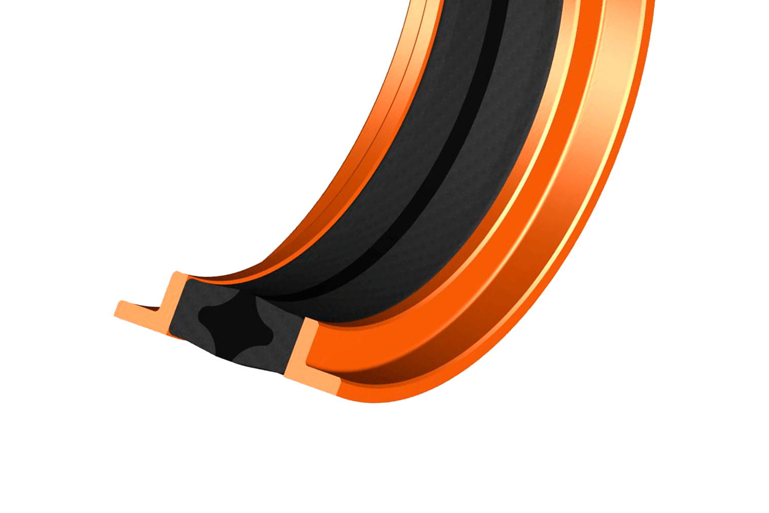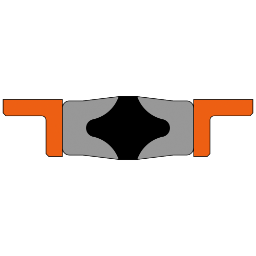 - L'ensemble se compose d'un joint et de deux paliers en forme de L. Le centre du joint est constitué de caoutchouc qui est collé à deux bases de section en «U» en tissu caoutchouté et compressé par le boîtier pour fournir un joint efficace à basse pression. Lorsque la pression augmente, le caoutchouc dynamise la section en ‘U’ et la déforme dans le logement, augmentant ainsi la zone d'étanchéité et améliorant le joint.