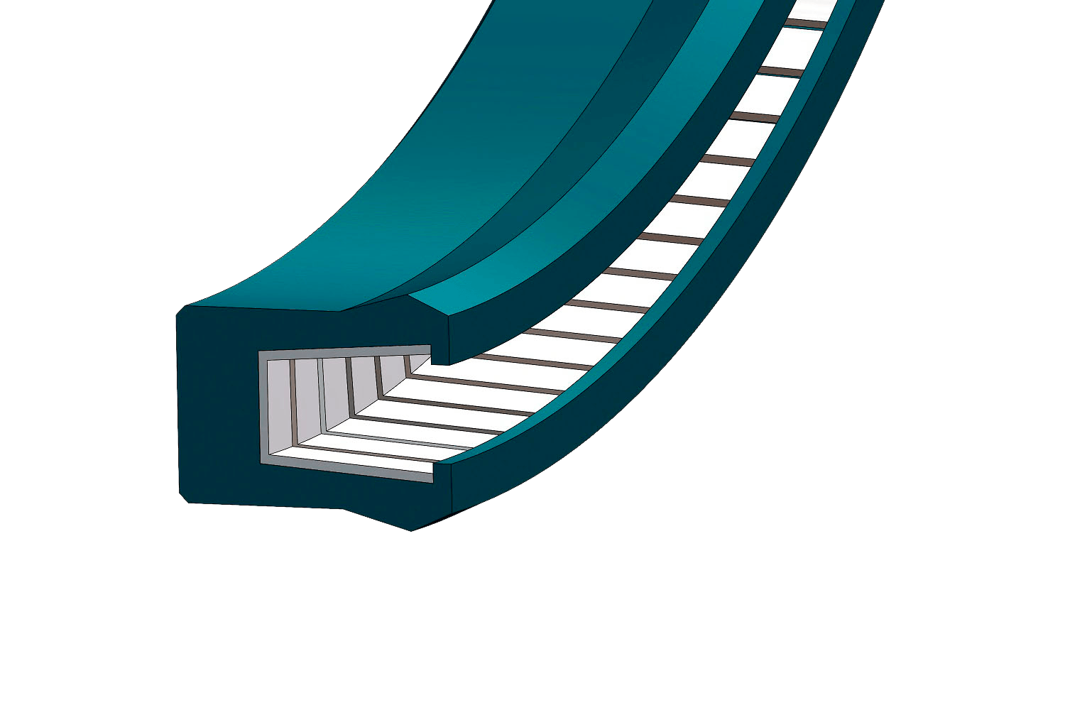 Joint à simple effet composé de deux éléments : un collier en PTFE (avec charges) et un ressort métallique qui tend le collier et maintient sa géométrie circulaire sur tout son périmètre, tant à l'intérieur qu'à l'extérieur.