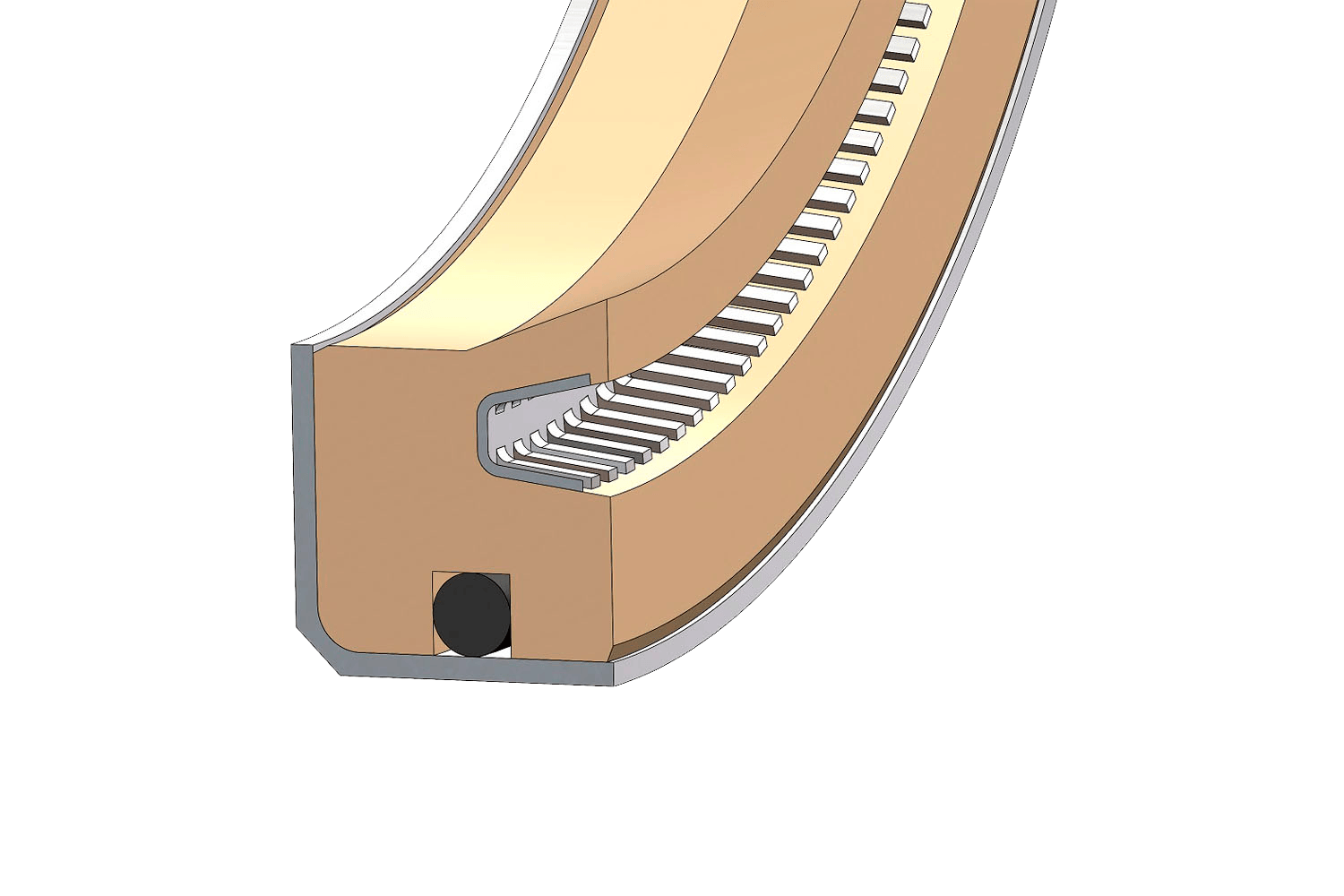 Collier énergisé avec ressort lamellaire et boîtier métallique, pour l'étanchéité de l'arbre et de la tige.