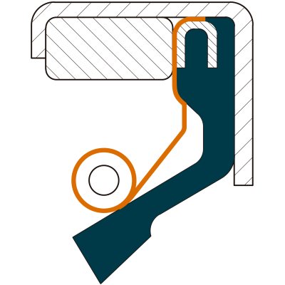 Retenue avec boîtier métallique, anneau de renforcement métallique et lèvre doublement chanfreinée avec ressort hélicoïdal intégré dans un ressort à lames.