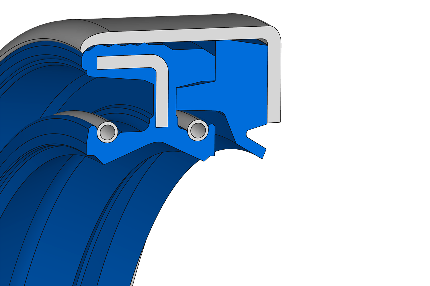 Joint à lèvre Simmerring® dans une configuration de lèvre et de lèvre anti-poussière «dos à dos», renforcée par un joint en polyuréthane qui permet de légers mouvements axiaux.