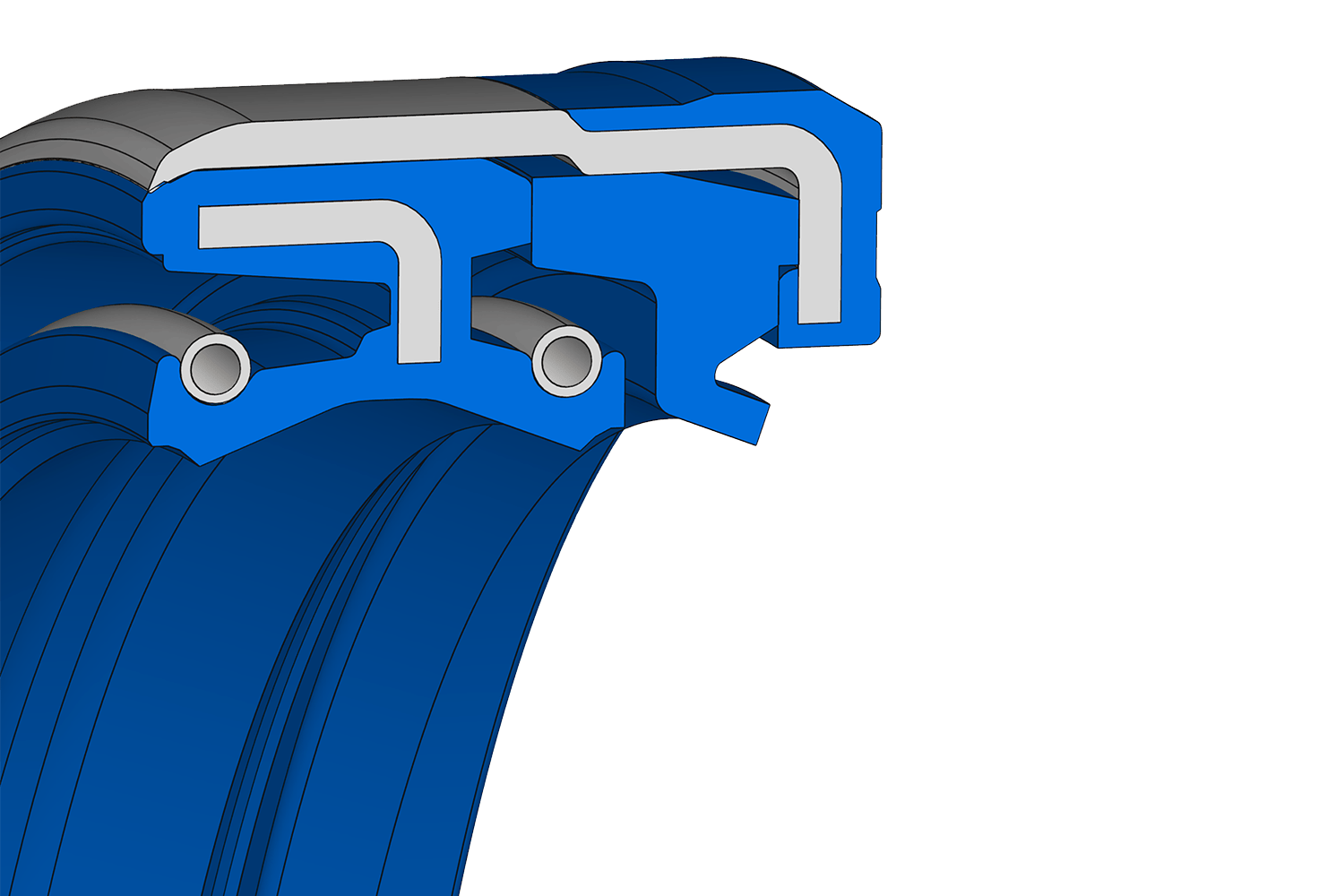 Joint à lèvre Simmerring® dans une configuration de lèvre et de lèvre anti-poussière «dos à dos», renforcée par un joint en polyuréthane qui permet de légers mouvements axiaux.