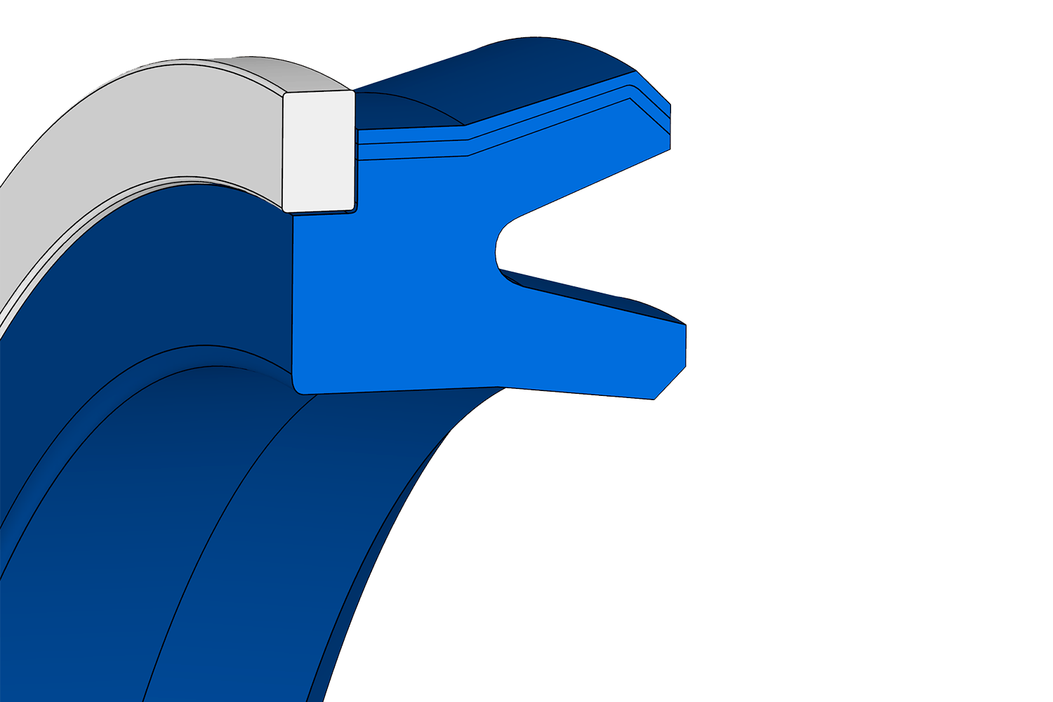 Joint à lèvre à profil asymétrique pour applications hydrauliques et pneumatiques à simple effet, avec bague anti-extrusion et renforcement en fibre de coton dans toute la zone de contact de la lèvre avec la tige du piston.